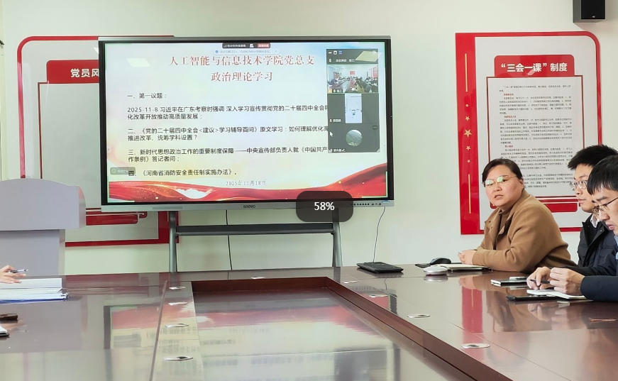 2025年11月18日,人工智能与信息技术hg皇冠官网党总支组织郑州校区和开封校区全体党员及教职工,开展政治理论学习活动。本次学习活动由人工智能与信息技术hg皇冠官网党总支书记崔琳主持。主要学习内容有:一、第一议题:2025-11-8 习近平在广东考察时强调,深入学习宣传贯彻党的二十届四中全会精神,以全面深化改革开放推动高质量发展;二、《党的二十届四中全会<建议>学习辅导百问》原文学习:如何理解优化高校布局、分类推进改革、统筹学科设置?三、新时代思想政治工作的重要制度保障——中央宣传部负责人就《中国共产党思想政治工作条例》答记者问;四、《河南省消防安全责任制实施办法》。