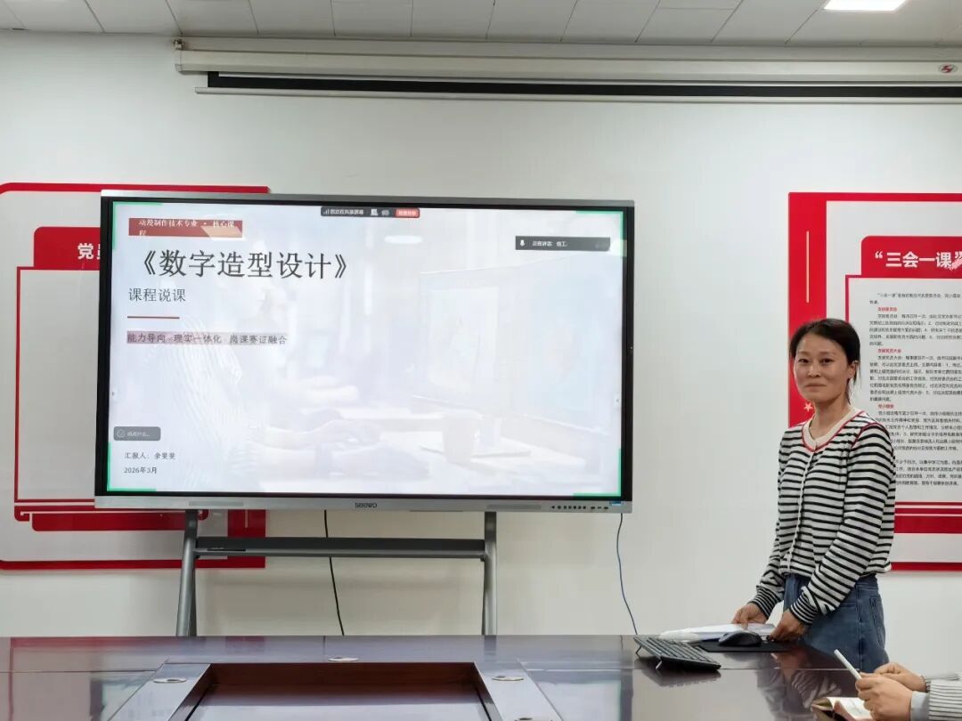 在说课环节,七位课程负责人依次登台进行汇报。张振平老师的《网络系统集成》紧扣行业标准与职业资格认证要求,采用项目化教学组织逻辑,着力培养学生网络规划与系统集成能力;孙奕老师的《基站建设与维护》紧密对接通信行业岗位需求,融入真实工程案例,强化学生规范操作意识与故障排查能力;李阔老师的《路由交换技术》遵循“基础—进阶—综合”的递进逻辑,融入技能大赛考核要点,并建有配套虚拟仿真平台支撑混合式教学;王碧琳老师的《品牌设计》紧跟行业前沿,引入企业真实命题驱动项目化教学,采用过程性考核与作品集评审相结合的评价方式;余斐斐老师的《数字造型设计》立足数字创意产业需求,突出模块化与递进性,将1+X证书标准融入教学单元,并开发了系列微课与实训案例库;左莉老师的《动漫软件基础》注重基础性与应用性相结合,采用任务驱动法通过典型项目引导学生掌握软件核心功能,评价方式注重过程考核与学习成效;付媛冰老师的《特效制作》聚焦影视特效行业标准,以项目实战贯穿教学全过程,着力培养学生特效制作与创意实现能力。
