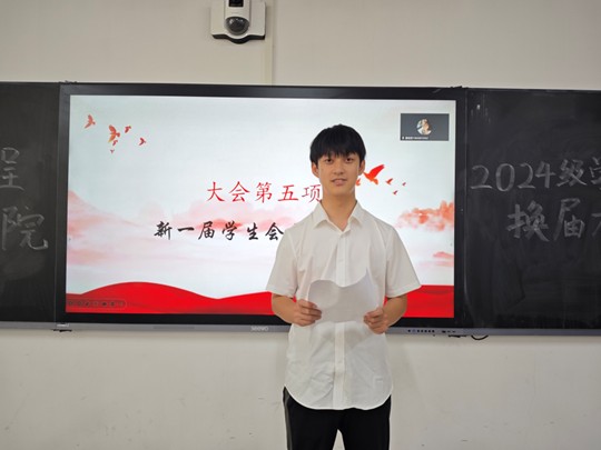 2023级学生会主席薛芷柔首先回顾了过去一年的工作历程。她谈到,学生工作不仅加深了同学之间的情感联系,也显著提升了个人能力与综合素质。她勉励新一届学生会干部积极投身hg皇冠官网各项活动,以高度的责任感和使命感推动学生会实现更高质量发展。
