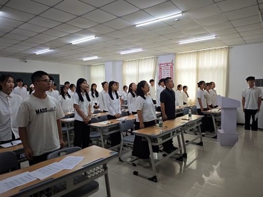 大会在庄严的国歌声中正式开始,全体成员起立奏唱,展现出昂扬的爱国情怀与精神风貌。